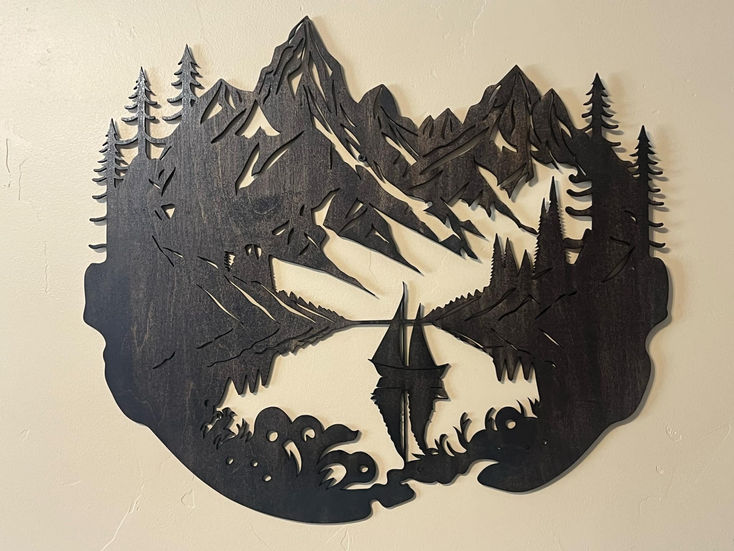 This collection showcases a variety of laser-cut wall art designs, including mountain and forest scenes, lighthouses, and intricate wooden designs. The pieces feature a combination of gears, animals, and text, creating a unique and visually appealing display.